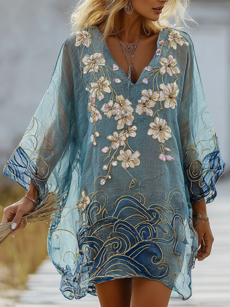 Blue Sequins Floral Boho Art Women's V-neck Short Sleeve Long Shirt