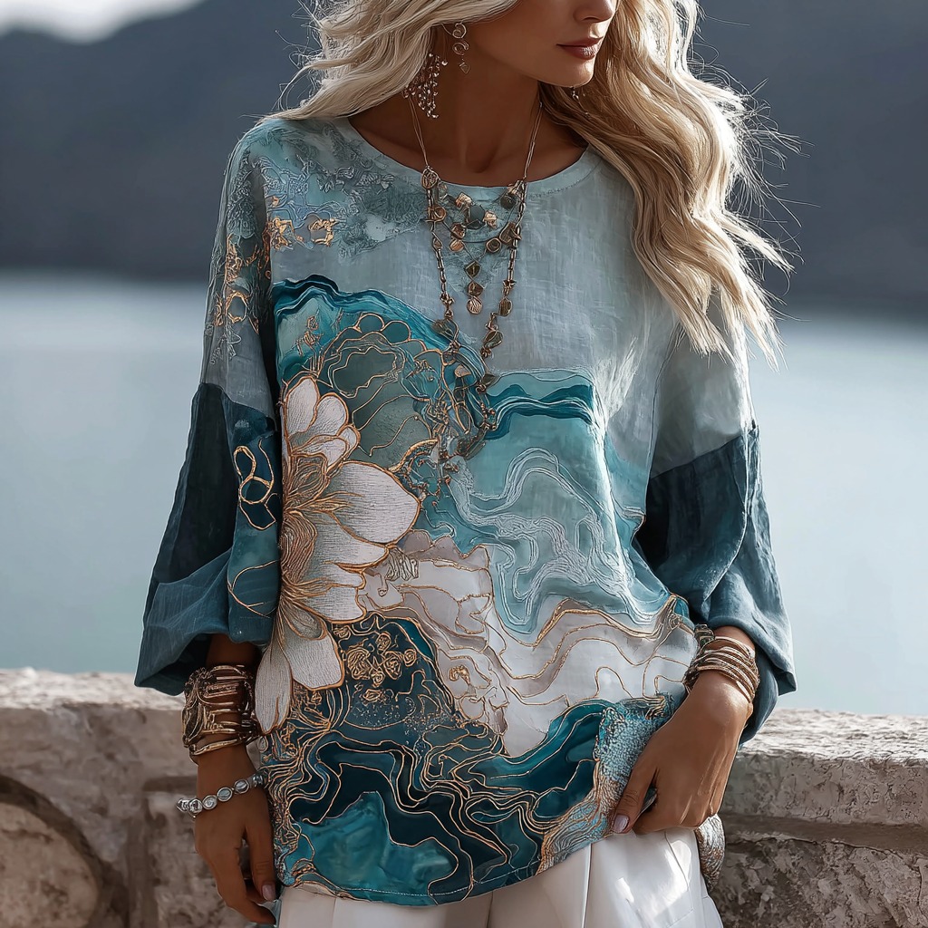 Vintage Gradient Marble Texture Floral Pattern Art Linen Three-quarter Sleeves Shirts