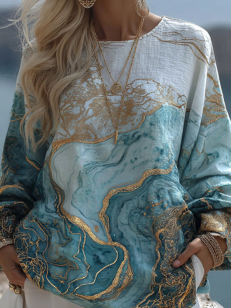 Vintage Marble Texture Collection Bohemia Gradient Gilded Pattern Linen Round Neck T-shirt