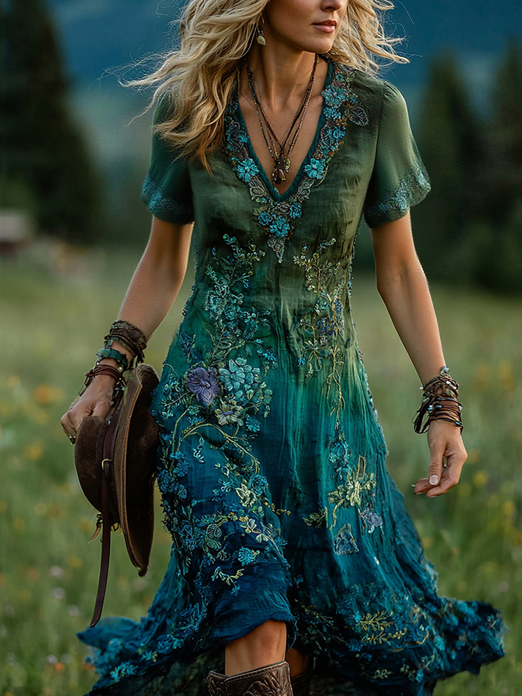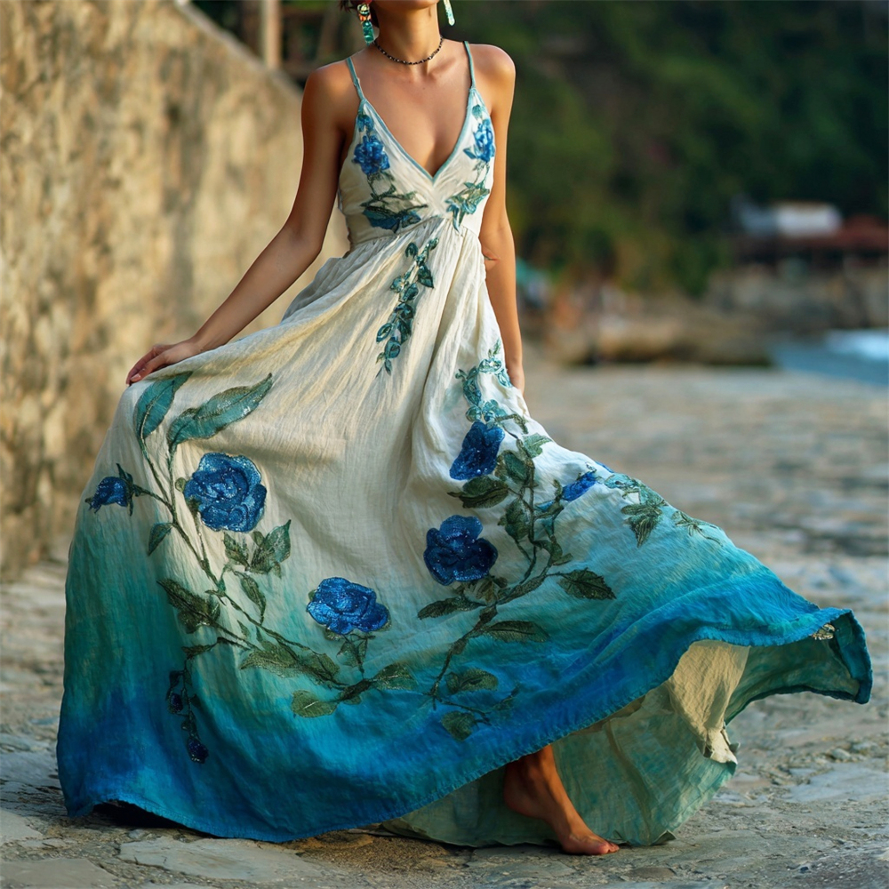 Vintage Classy Gradient Blue Rose And Floral Embroidered Linen V Neck Maxi Dress