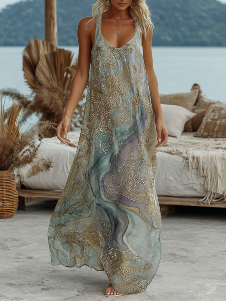 Vintage Marble Texture Collection Retro Bohemia Gradient Gilded Pattern Linen Maxi Dress