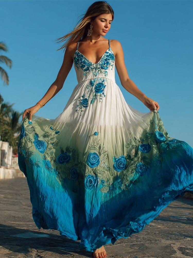 Elegant Boho Floral Gradient Embroidery Women's Spaghetti Strap Maxi Dress