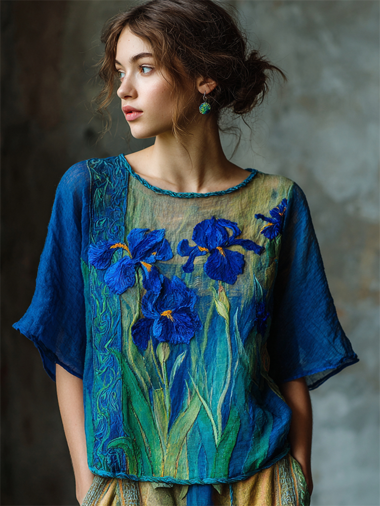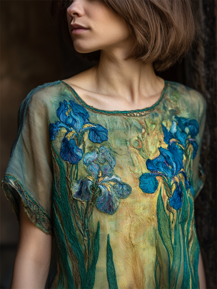 Oil Painting Irises Embroidered Flowy Linen Tunic