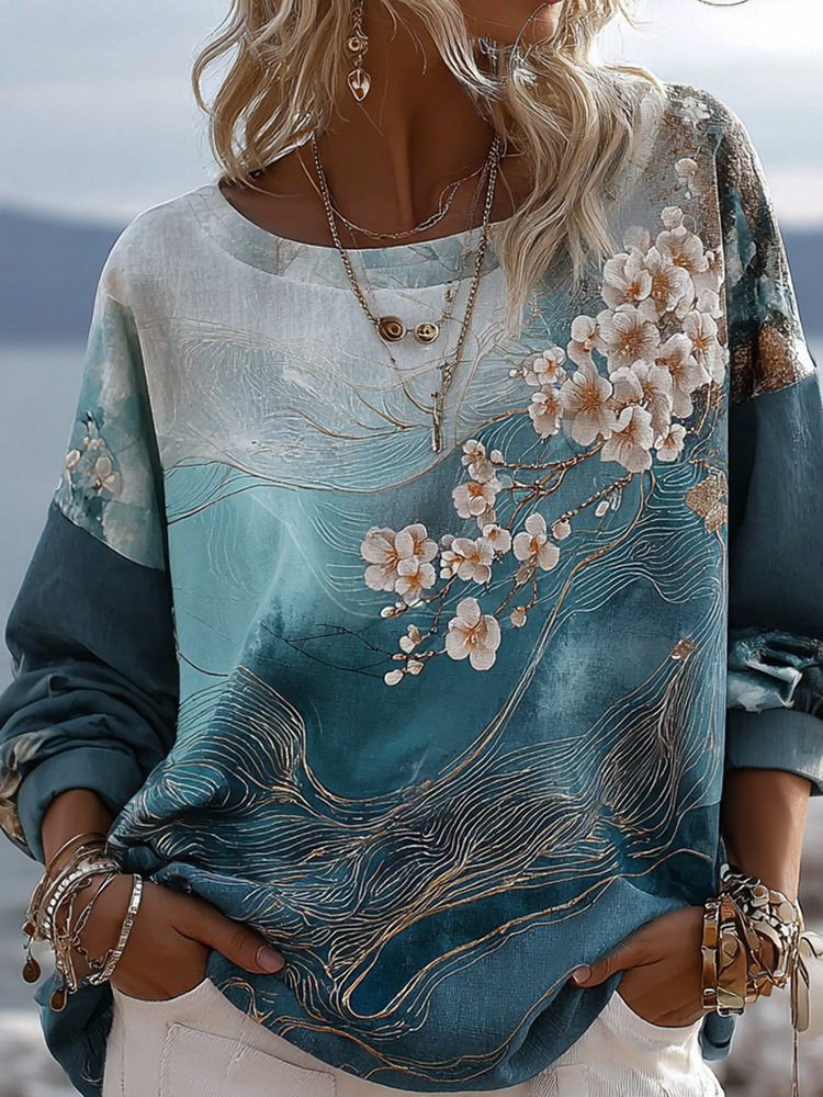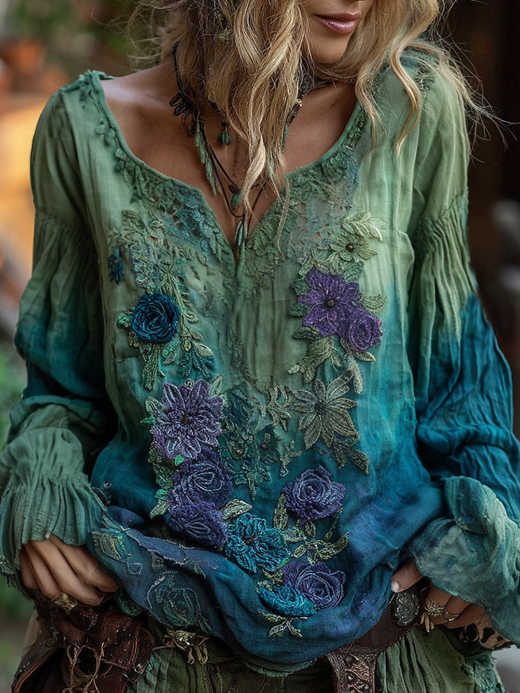 Vintage Classy Gradient Blue Rose And Floral Embroidered Pattern V Neck Long Sleeve Shirt