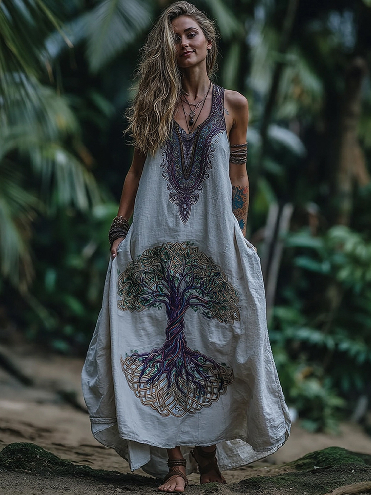 Women's Vintage Viking Tree Of Life Print V-neck Linen Blend Tank Midi Dress