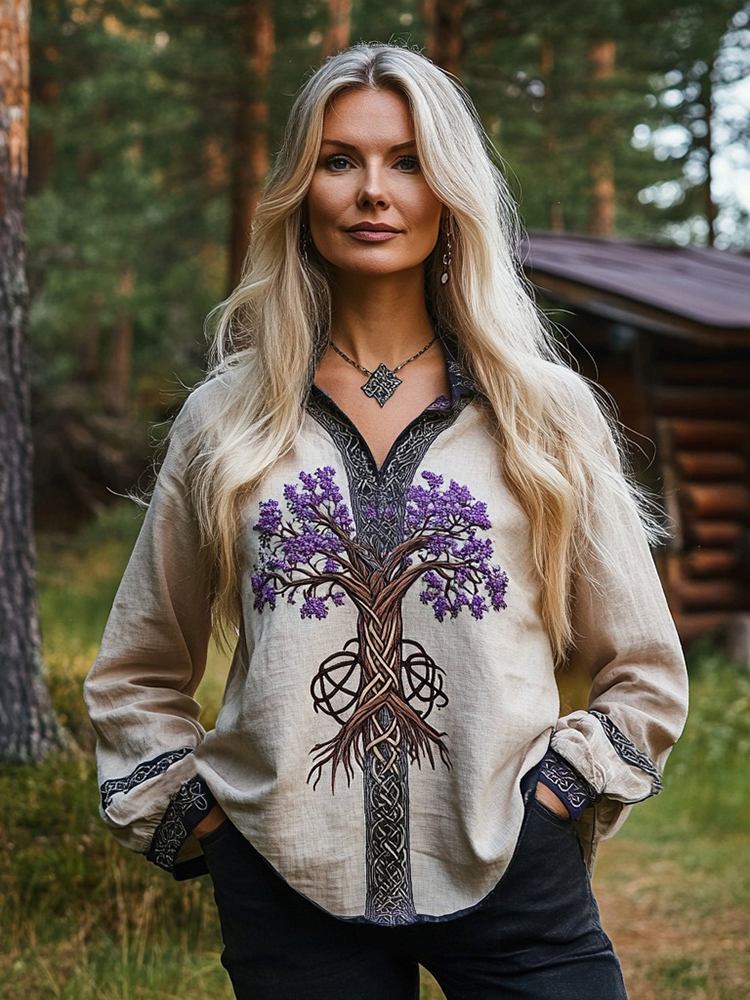 Women's Viking Purple Blossom Tree Of Life Cotton And Linen Long Sleeve Lapel Shirt