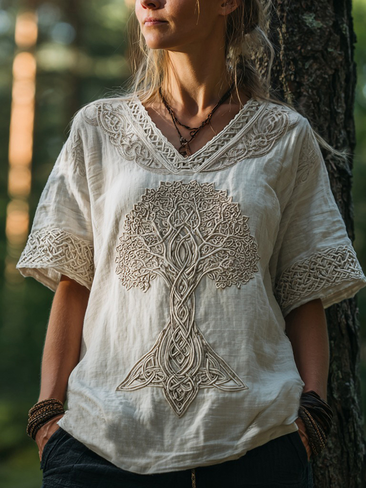 Vintage Viking Life Of Tree Embroidered Art Linen T-shirt