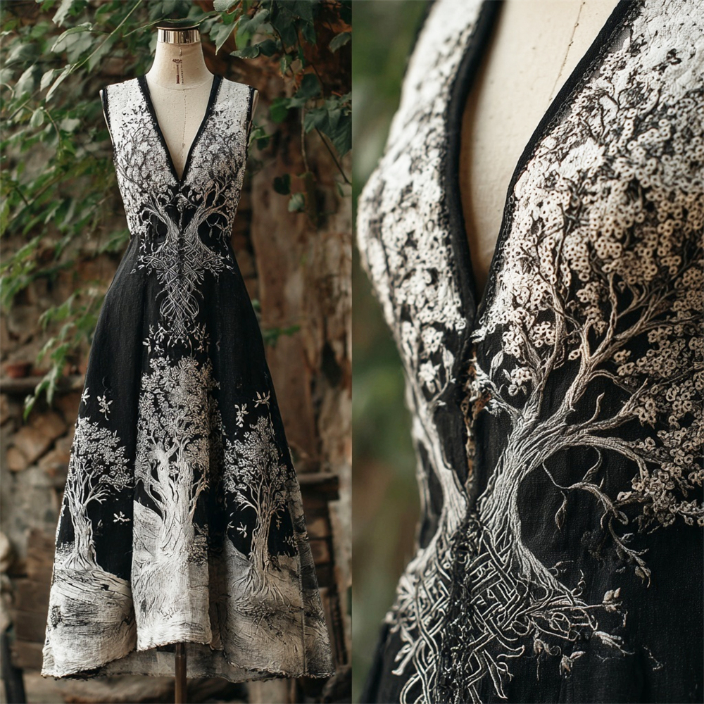 Nordic Myth Tree Of Life Black And White Embroidery Women's Linen V-neck Vest Maxi Dress