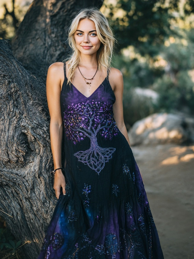 Vintage Tree Of Life Sequin Embroidery Women's V Neck Spaghetti Strap Maxi Dress