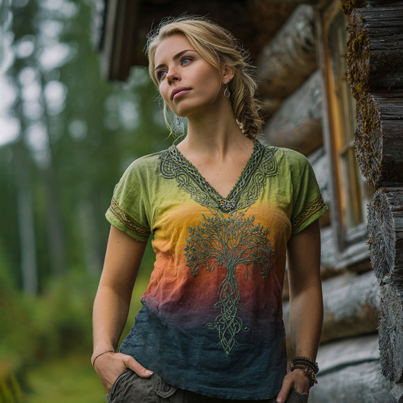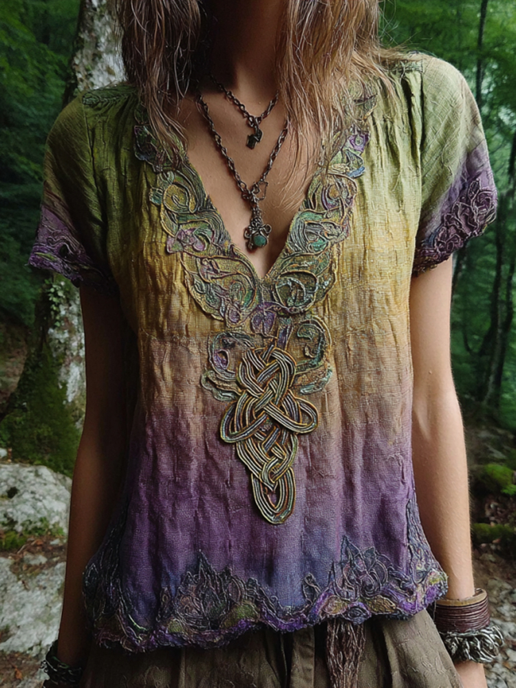 Women's Vintage Viking Celtic Knot Embroidery Gradient Art Shirt
