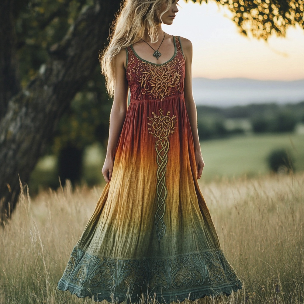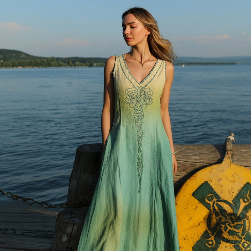Viking Inspire Celtic Knot Embroidered Gradient Linen Maxi Dress
