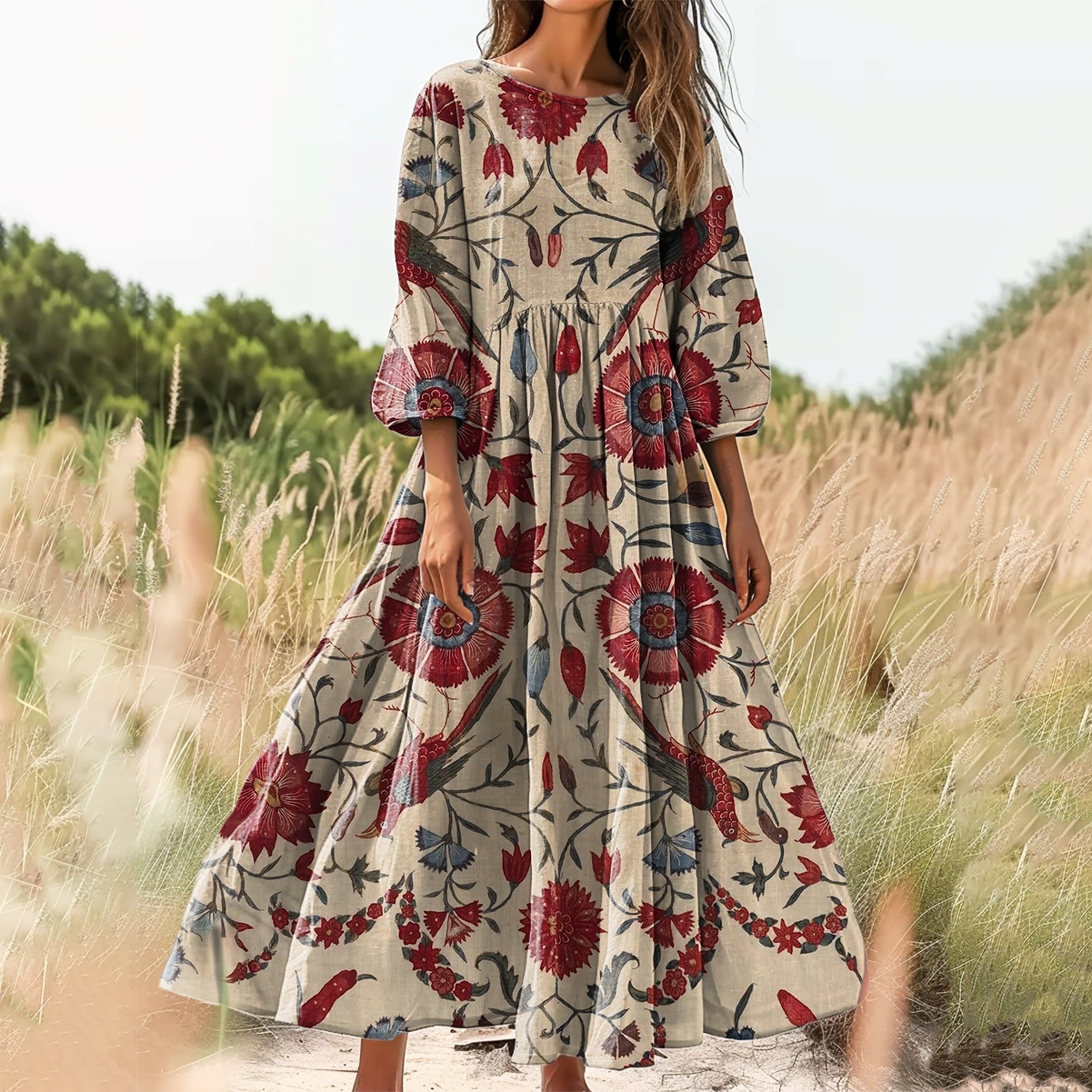 Women's Vintage Ethnic Floral Art Print Flowy Cotton Crew Neck Dress