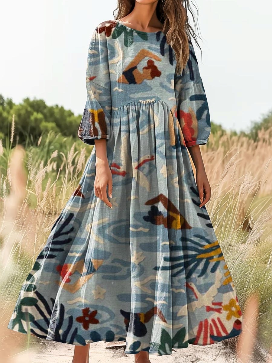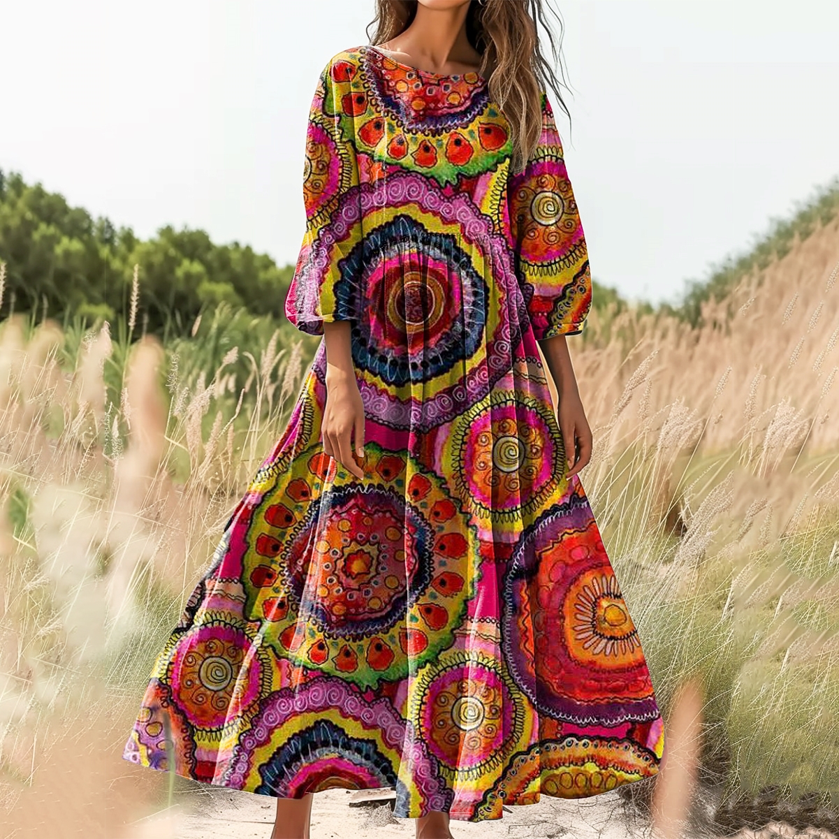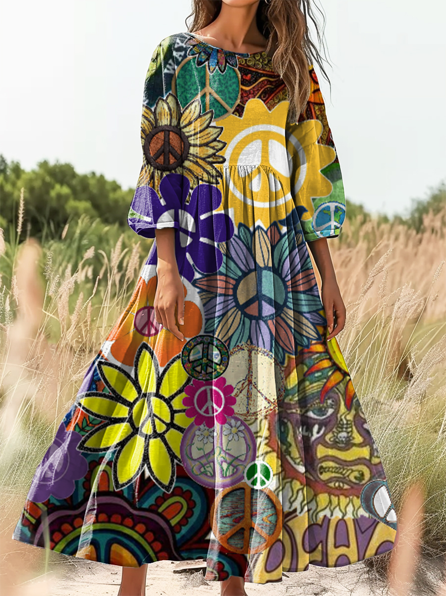 Women's Hippie Art Print Flowy Cotton Crew Neck Dress