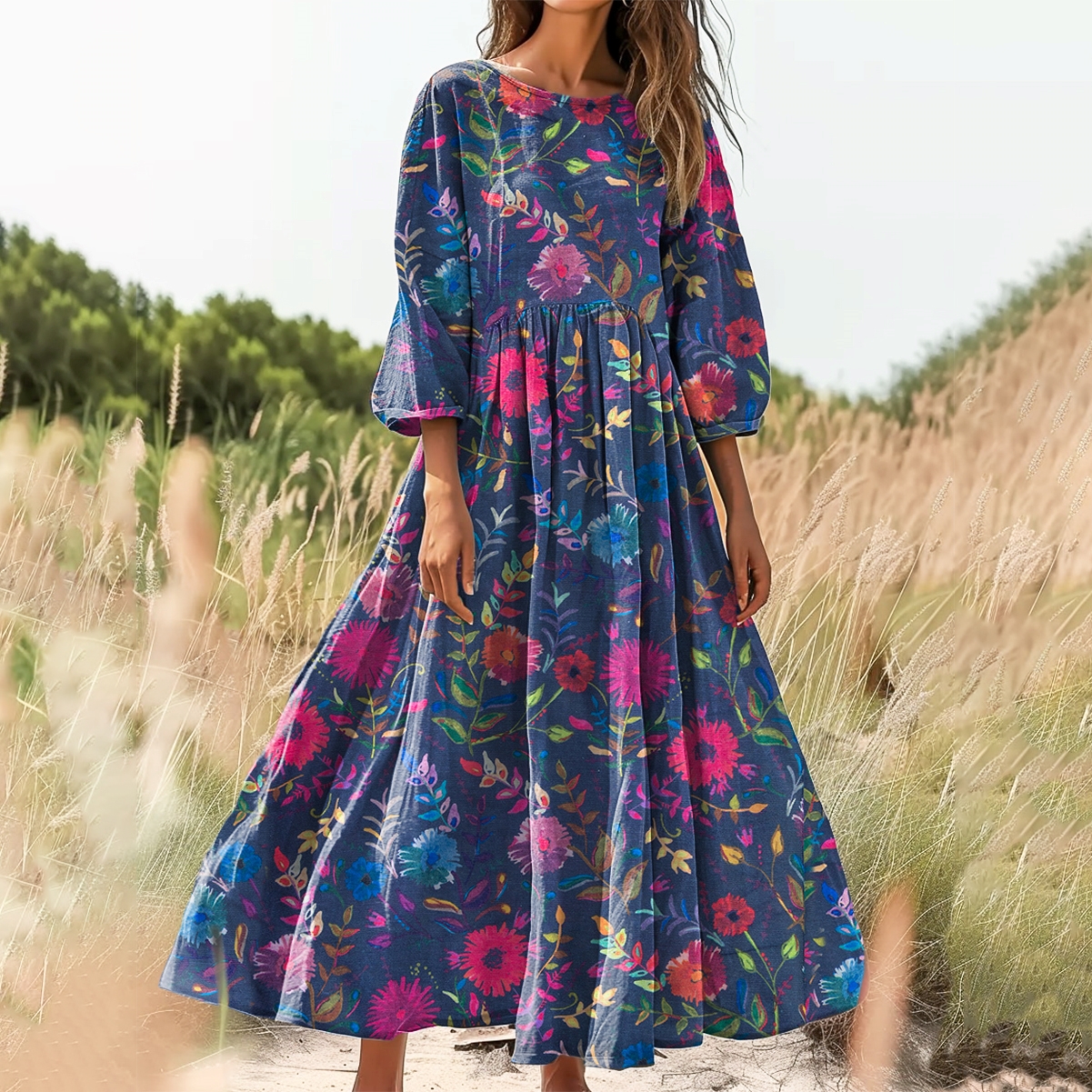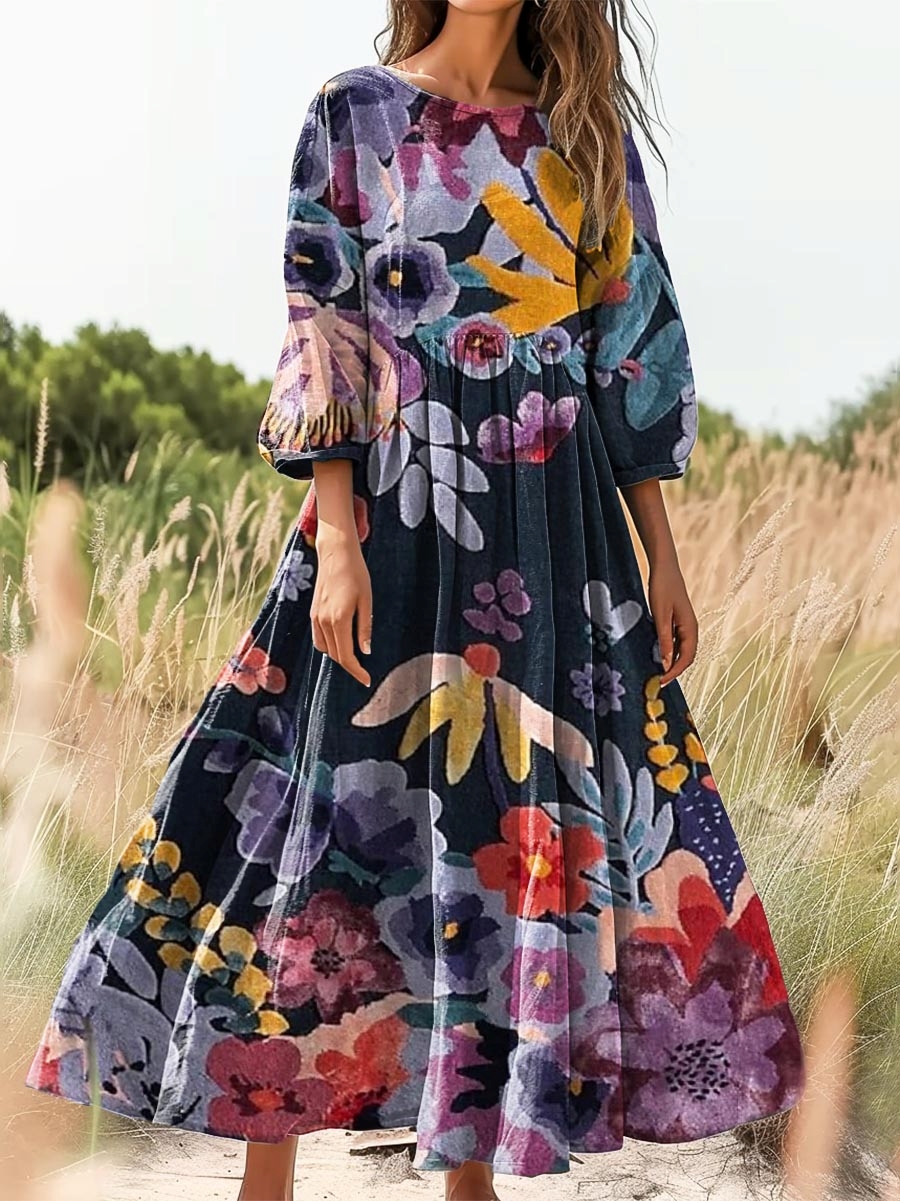 Women's Vintage Folk Floral Art Print Flowy Cotton Crew Neck Dress