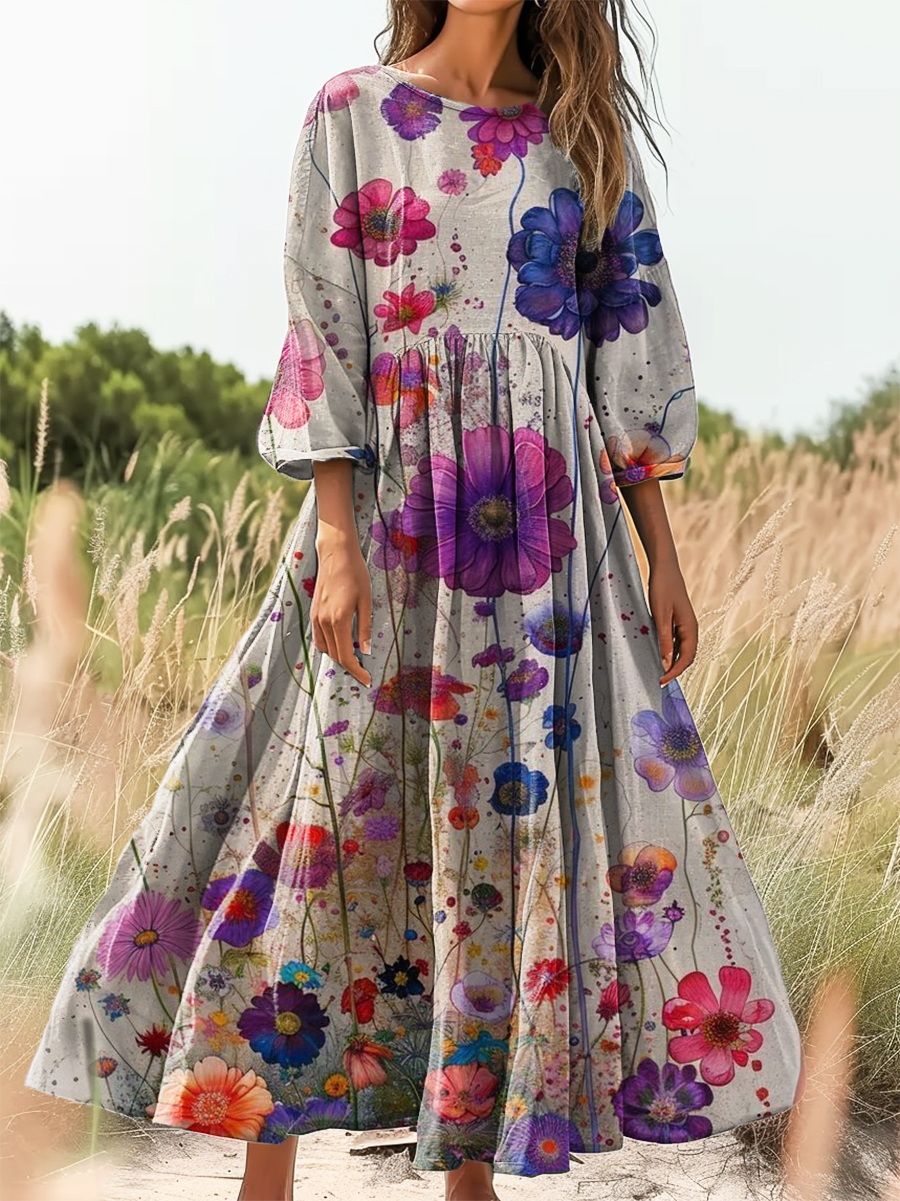 Women's Bohemian Floral Art Print Flowy Cotton Crew Neck Dress