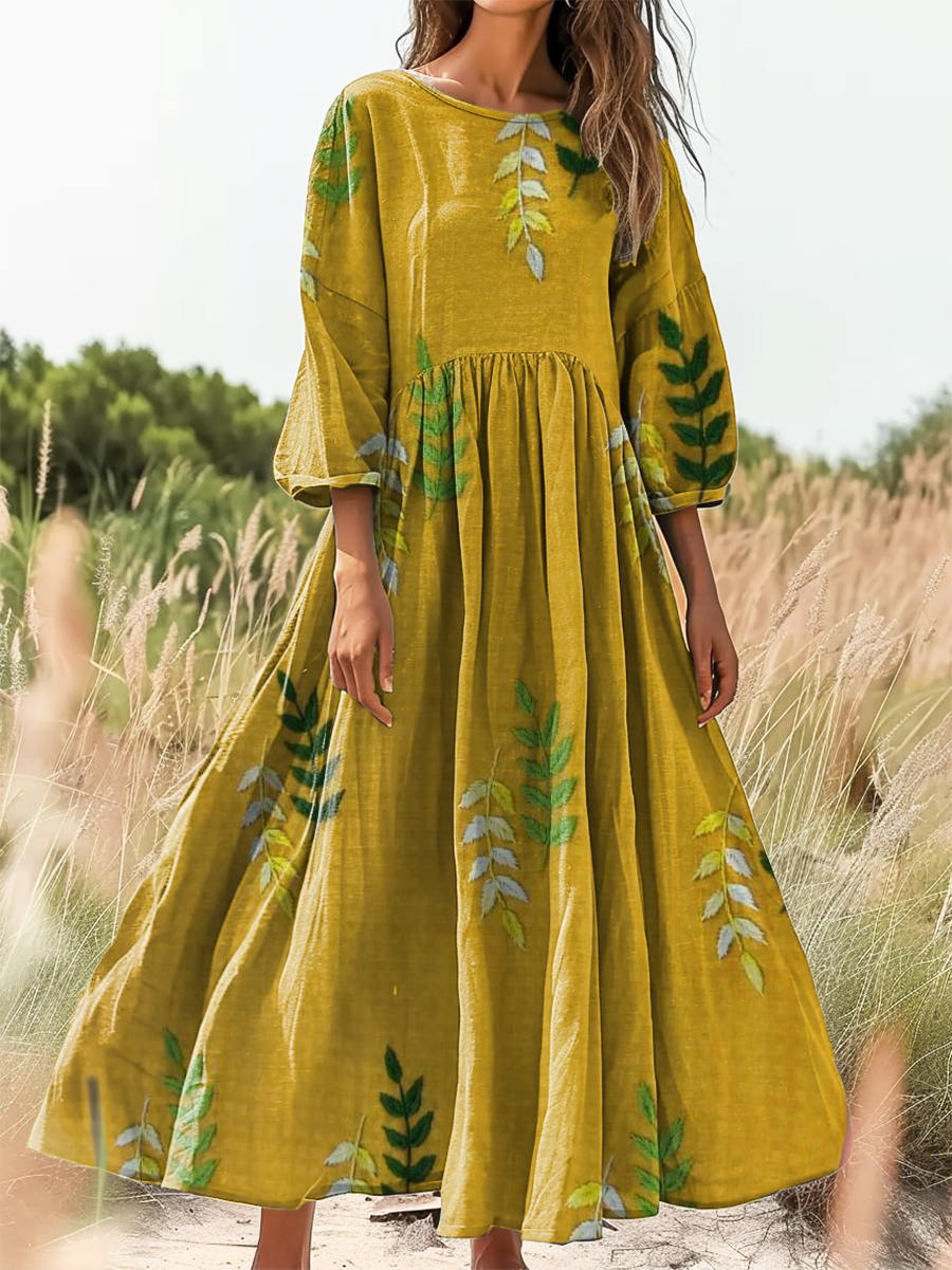 Women's Vintage Leaf Art Print Flowy Cotton Crew Neck Dress