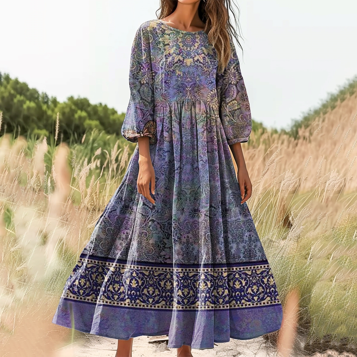 Women's Vintage Ethnic Art Print Flowy Cotton Crew Neck Dress