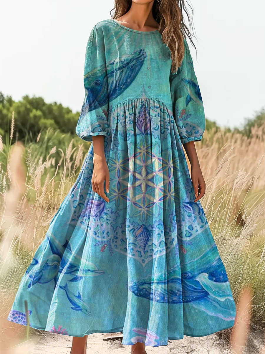 Women's Vintage Floral Whale Art Print Flowy Cotton Crew Neck Dress
