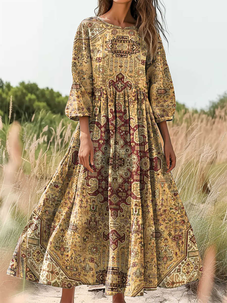Women's Vintage Ethnic Floral Art Print Flowy Cotton Crew Neck Dress