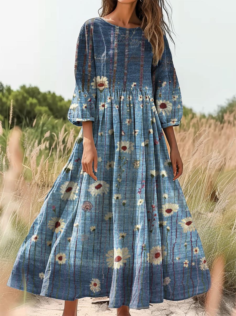 Women's Vintage Bohemian Floral Art Print Flowy Cotton Crew Neck Dress