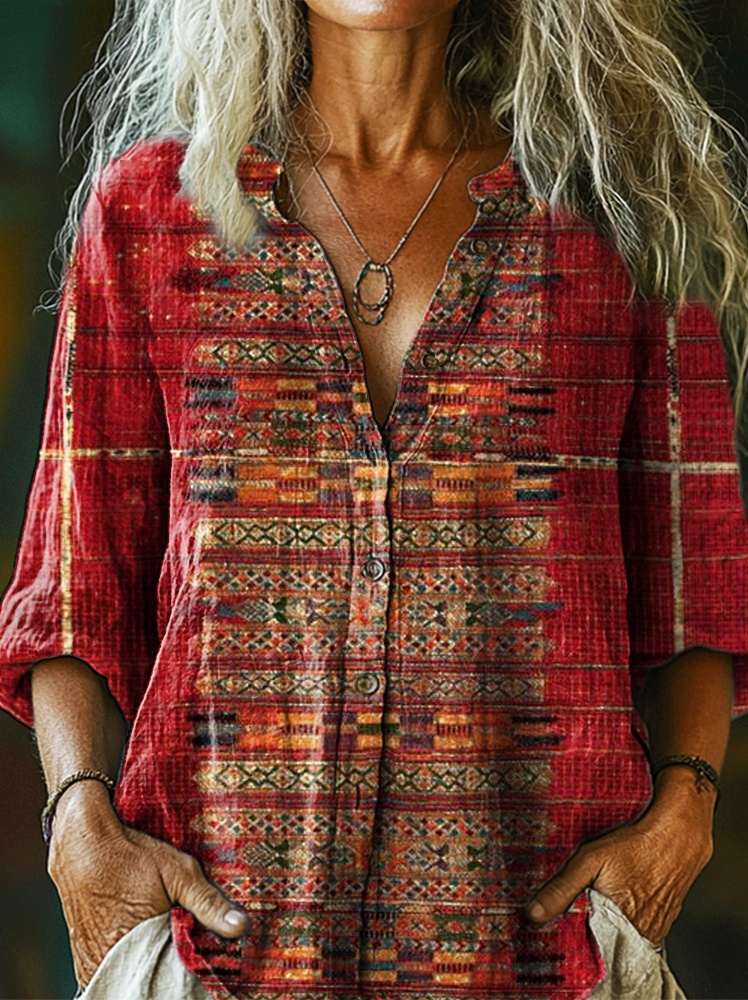 Women's Vintage Bohemian Pattern Art Print Casual Cotton Linen Shirt