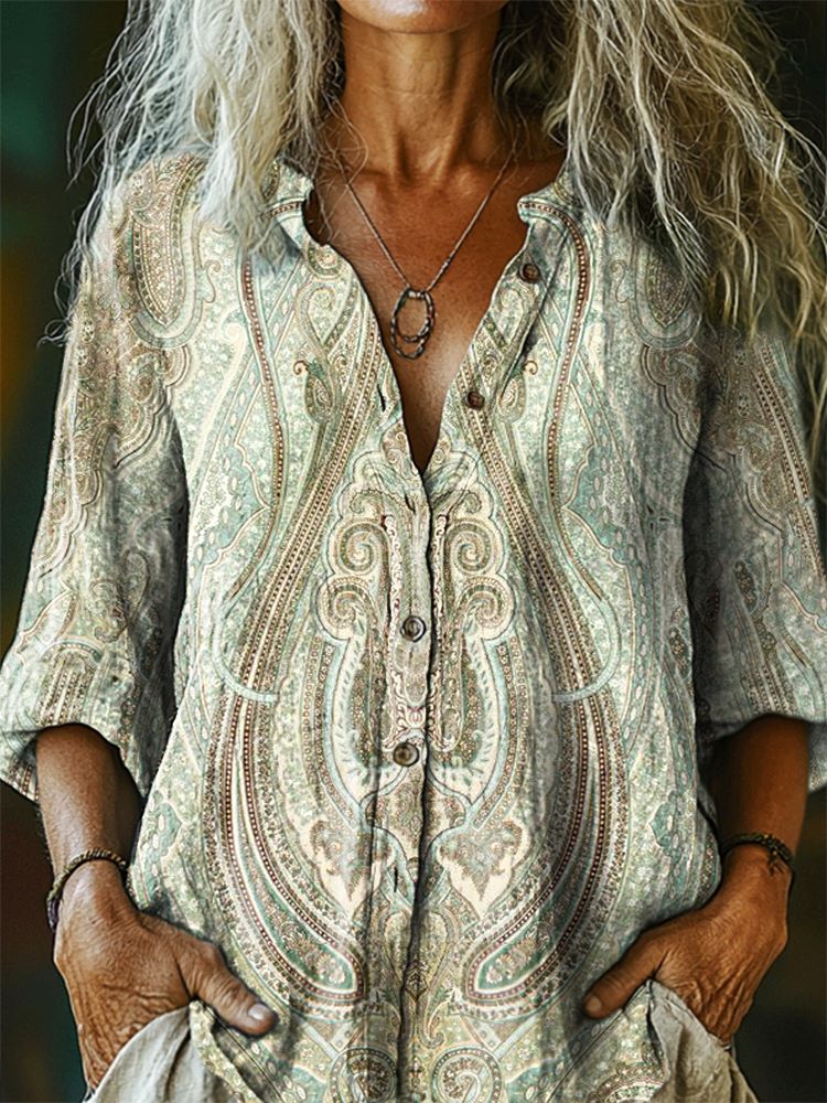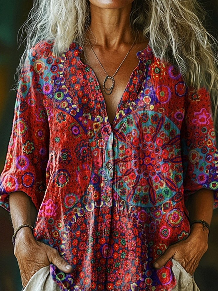 Women's Vintage Bohemian Pattern Art Print Casual Cotton Linen Shirt