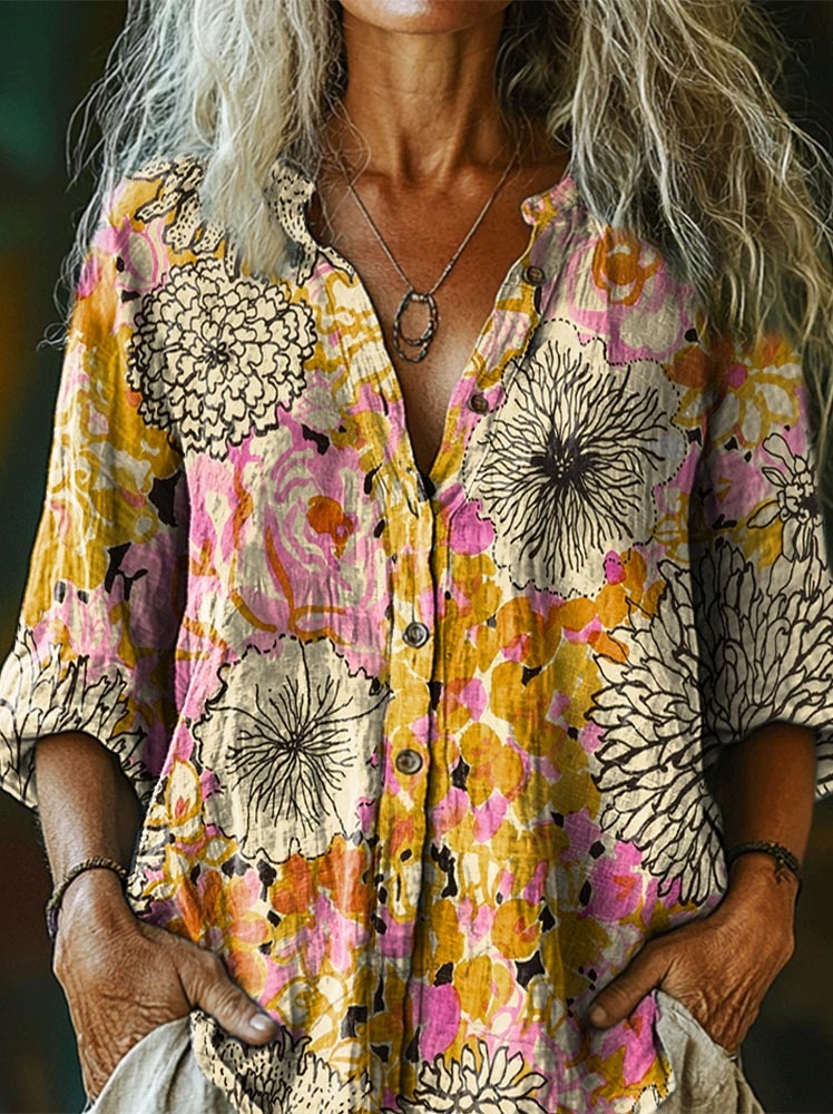 Women's Vintage Bohemian Floral Art Print Casual Cotton Linen Shirt