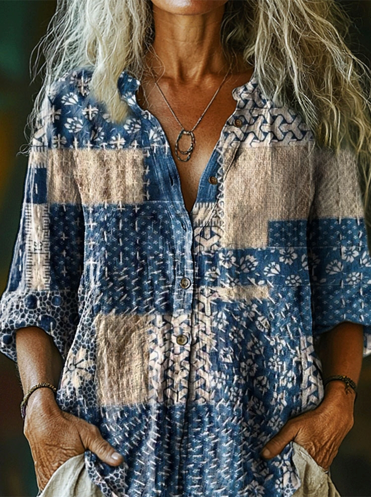 Women's Bohemian Ethnic Patchwork Art Pattern Print Casual Cotton Linen Shirt