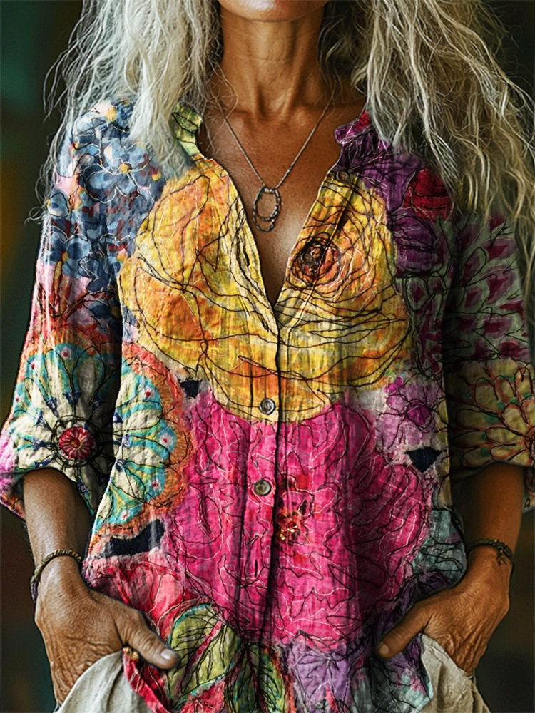 Women's Bohemian Floral Art Print Casual Cotton Linen Shirt