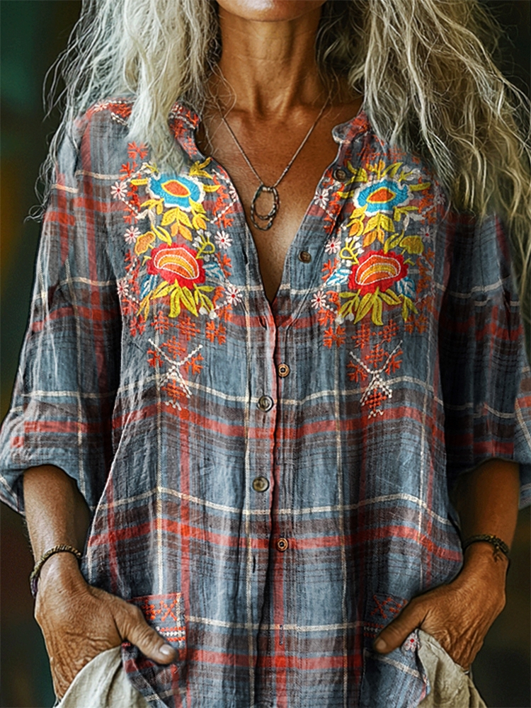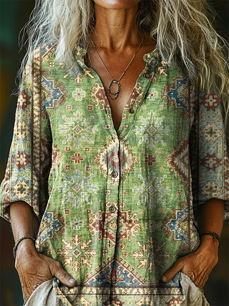 Women's Vintage Ethnic Floral Art Print Casual Cotton Linen Shirt