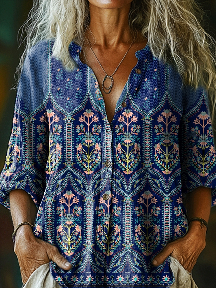 Women's Vintage Bohemian Floral Art Print Casual Cotton Linen Shirt