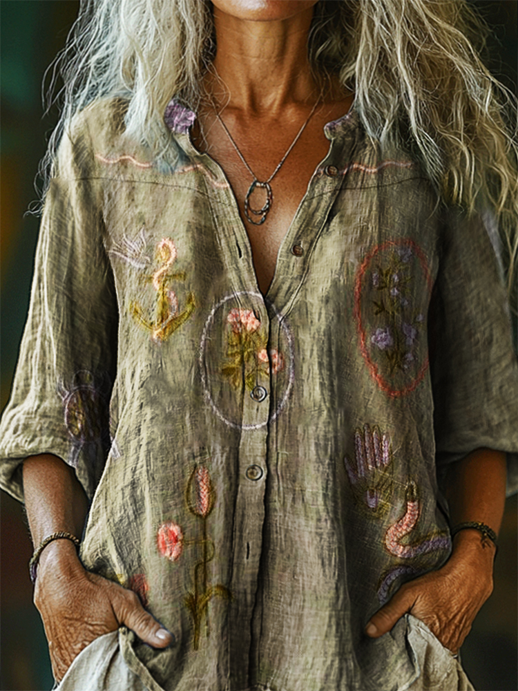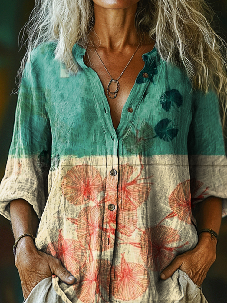 Women's Vintage Floral Art Print Casual Cotton Linen Shirt