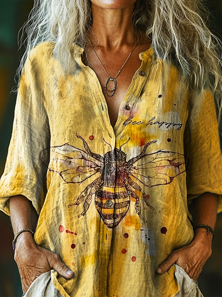 Women's Retro Bee Happy Art Print Casual Cotton Linen Shirt