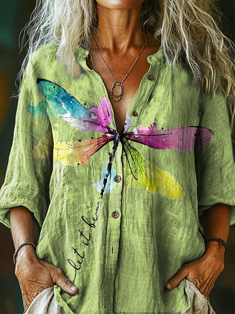 Women's Retro Dragonfly Let It Be Print Casual Cotton Linen Shirt