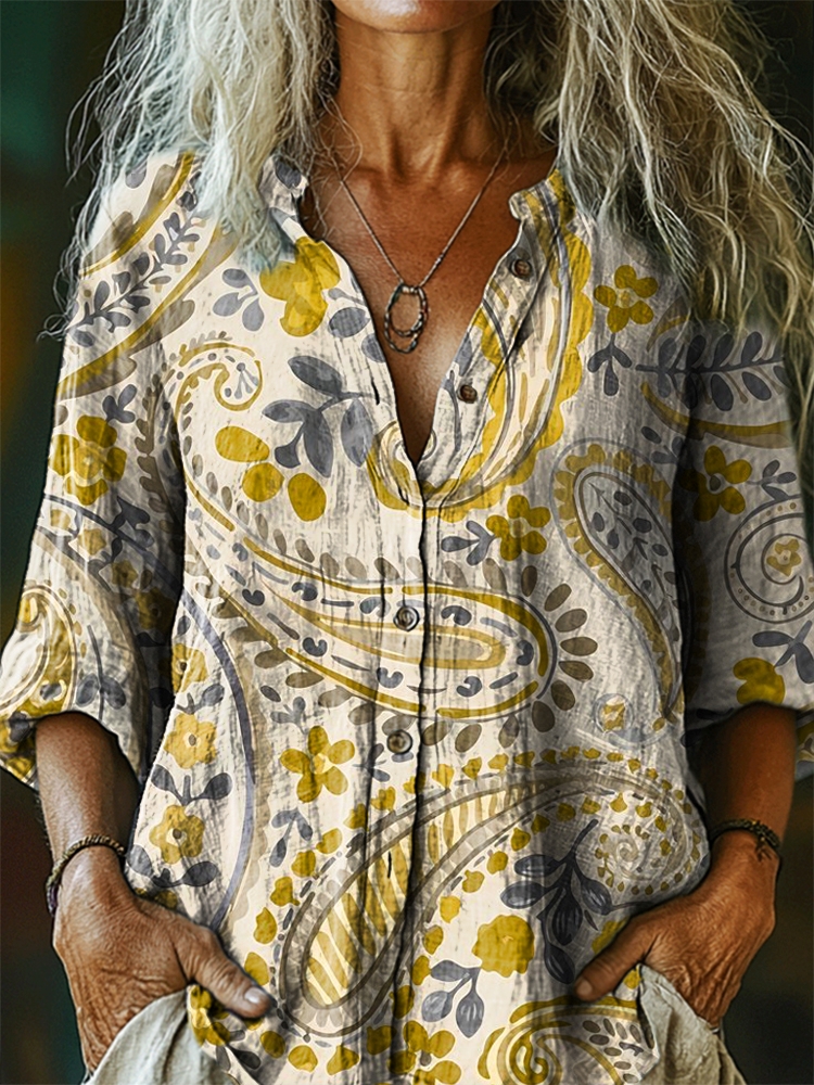 Women's Vintage Ethnic Cashew Flower Trimmed Pattern Art Printed Linen Cotton Casual Shirt