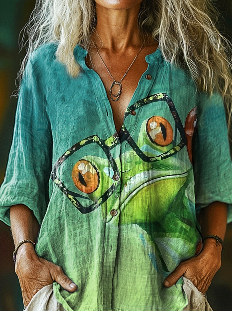 Women's Gradient Cute Frog Art Print Casual Cotton Linen Shirt