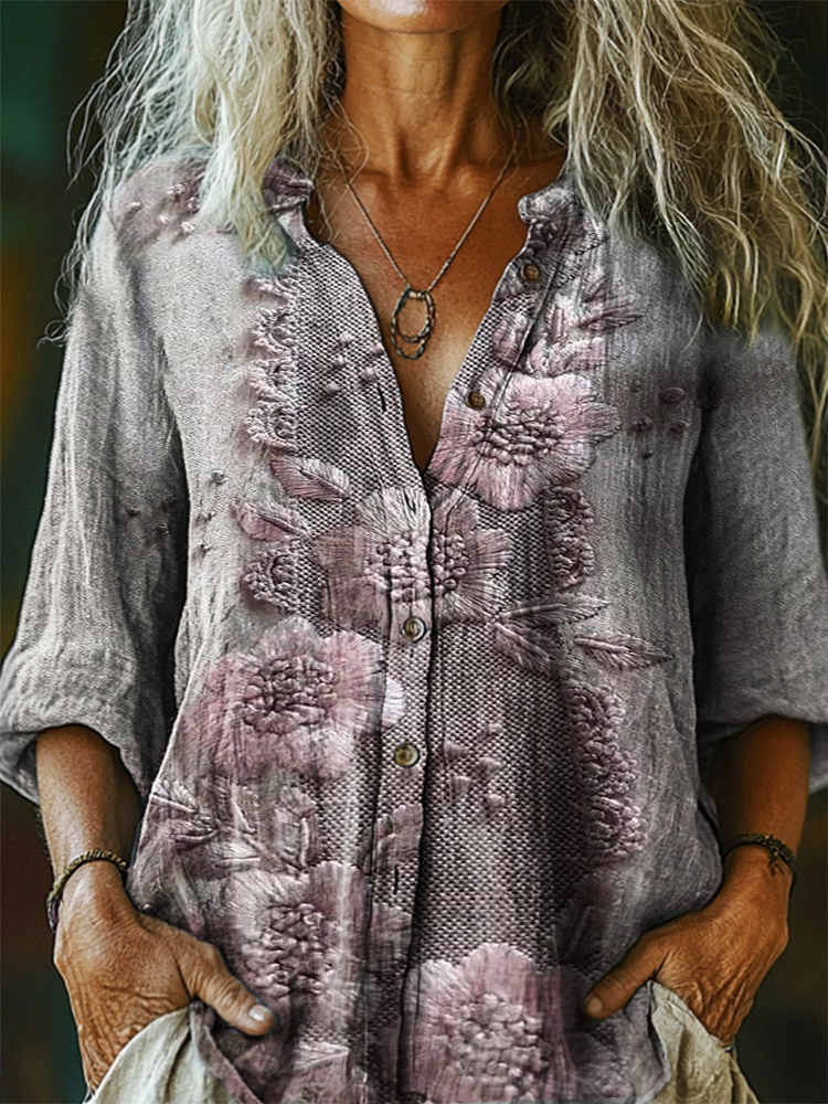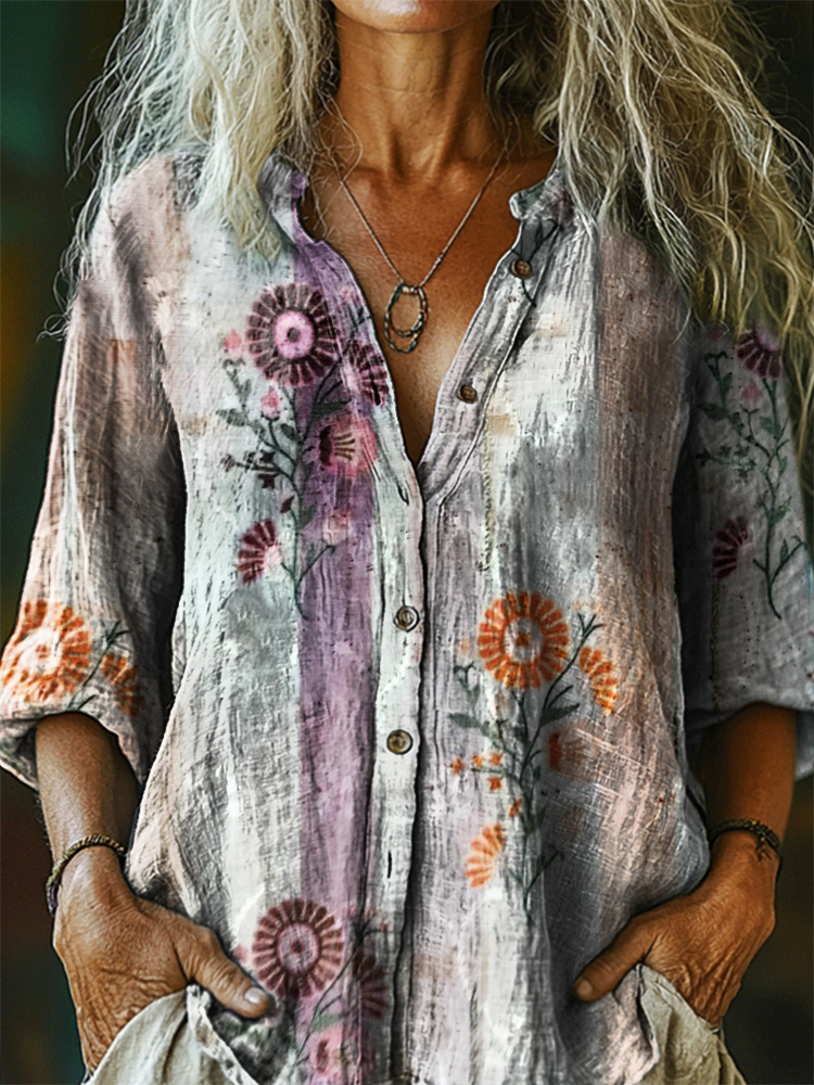Women's Retro Flowers Art Print Casual Cotton Linen Shirt
