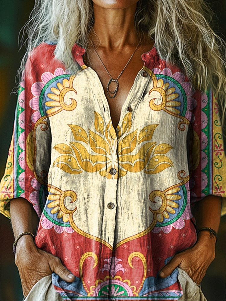 Women's Boho Lotus Embellished Pattern Art Print Linen Cotton Casual Shirt