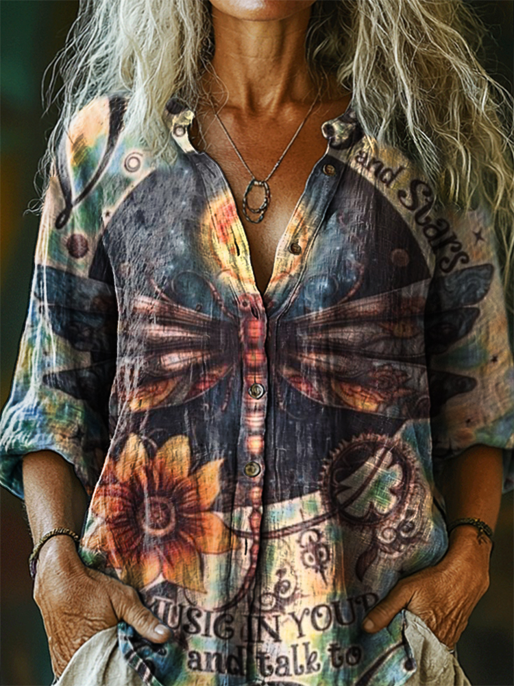 Women's Hippie Dragonfly Art Print Casual Cotton Linen Shirt
