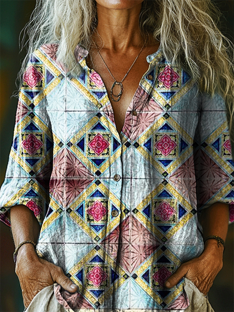 Women's Vintage Ethnic Floral Patchwork Art Print Casual Cotton Linen Shirt