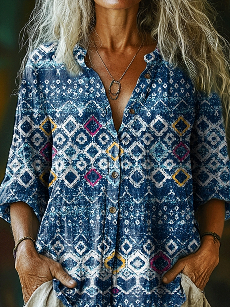 Women's Retro Gradient Ethnic Totem Art Print Casual Cotton Linen Shirt