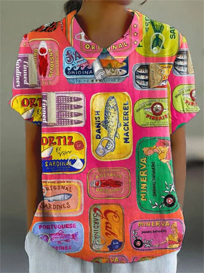Women's Vintage Fish Sardines Art Print Casual Cotton And Linen V-neck Shirt