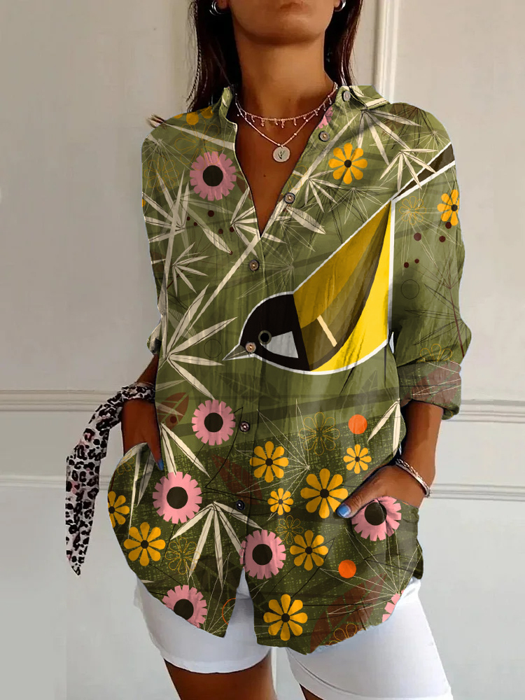 Vintage Bird Art Print Casual Long Sleeve Shirt