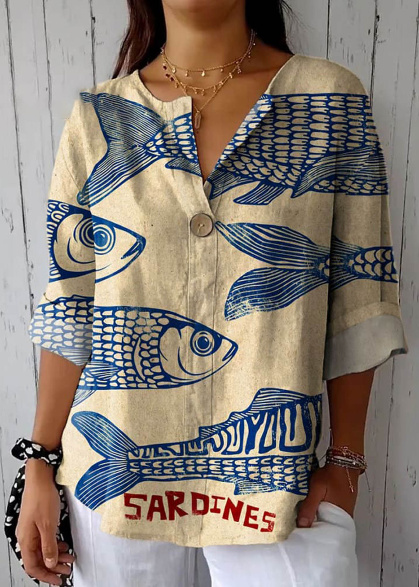 Women's Vintage Fish Sardine Art Print Casual Cotton Linen Shirt