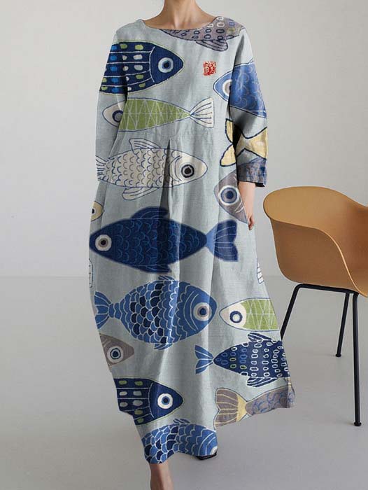 Vintage Fish Japanese Art Blend Crew Neck Long Sleeve Dress