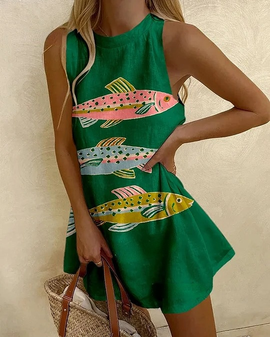 Casual Sardine Print Sleeveless Dress