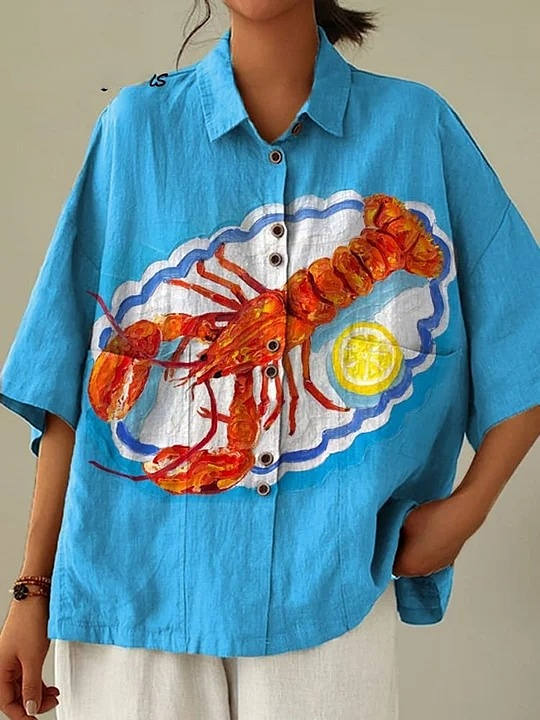 Women's Vintage Lovely Lobster Art Print Casual Cotton Linen Shirt