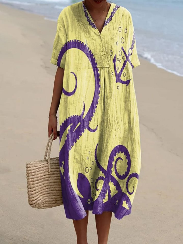 Fresh Lobster Art Casual V-Neck Midi Dress