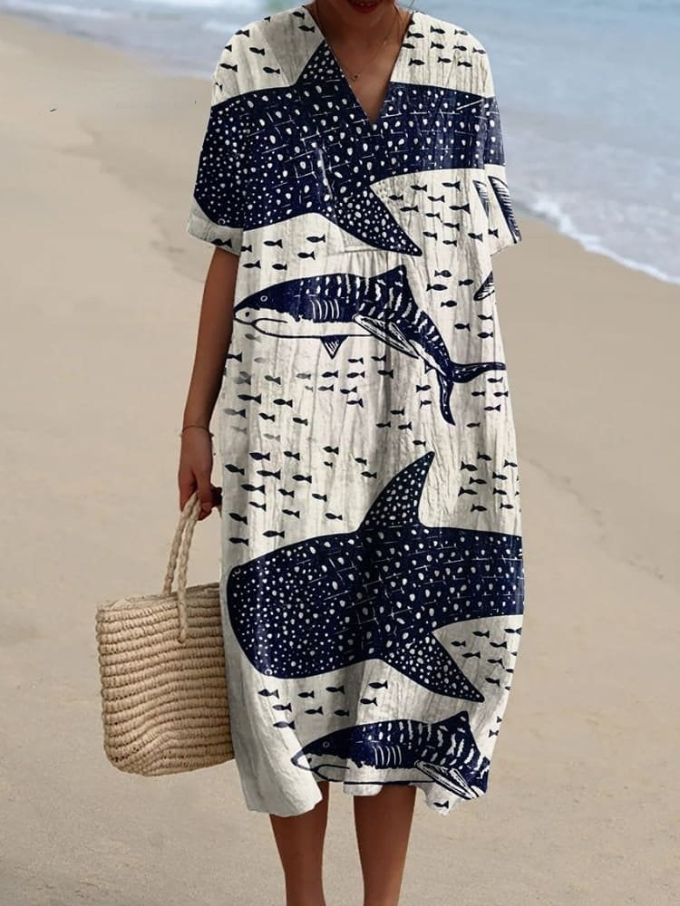Women's Vintage Fish Killer Whale Art Print Flowy Dress