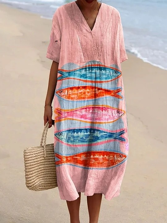 Women's Vintage Lovely Fish Art Print Pocket Cotton Dress